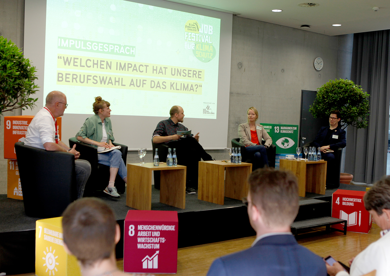 Zum Auftakt der Veranstaltung gab es ein Impulsgespräch zur Frage “Welchen Impact hat unsere Berufswahl auf das Klima?”. Es diskutierten: Umweltministerin Thekla Walker MDL, Zukunftsgestalterin Johanna Ernst von Ab in die Transformation, Peter Haas vom klimarelevanten Dachverband Handwerk BW und Lukas Zimmermann von youpaN.